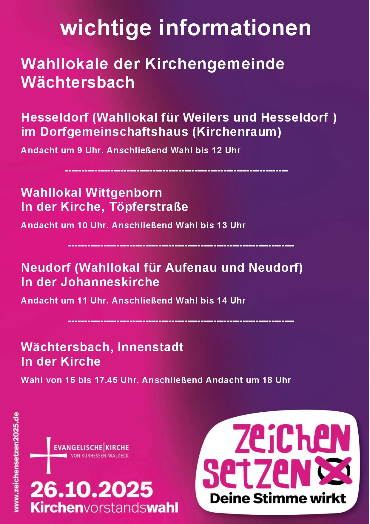 Am 26. Oktober haben alle Gemeindemitglieder der evangelischen Kirchengemeinden Spielberg-Waldensberg und Wächtersbach die Möglichkeit, ihre Kirchengemeinde aktiv mitzugestalten und ein starkes Zeichen zu setzen – indem sie wählen gehen.